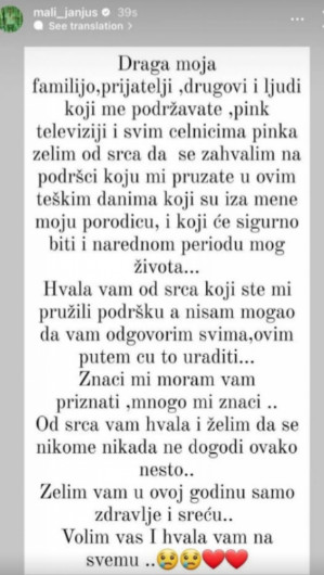 – Draga moja familijo, prijatelji, drugovi i ljudi koji me podržavate, Pink televiziji i svim čelnicima Pinka želim od srca da se zahvalim na podršci koju mi pružate u ovim teškim danima koji su i za mene i moju porodicu i koji će sigurno biti u narednom periodu mog života. Hvala vam od srca koji ste mi pružili podršku, a nisam mogao da vam odgovorim, ovim putem ću to uraditi. Znači ne moram vam priznati, mnogo mi znači. Od srca vam hvala i želim da se nikome nikad ne dogodi ovako nešto. Želim vam u ovoj godini samo zdravlje i sreću. Volim vas i hvala na svmu – napisao ja Janjuš na svom Instagram profilu.