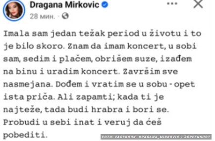 – Imala sam jedan težak period u životu i to je bilo skoro. Znam da imam koncert, u sobi sam, sedim i plačem, obrišem suze, izađem na binu i uradim koncert. Završim sve nasmejana. Dođem i vratim se u sobu – opet ista priča. Ali zapamti, kada ti je najteže, tada budi hrabra i bori se. Probudi u sebi inat i veruj da ćeš pobediti – napisala je Dragana nedavno na svom Fejsbuk nalogu, dok je ova objava malo potom bila obrisana sa profila pevačice.