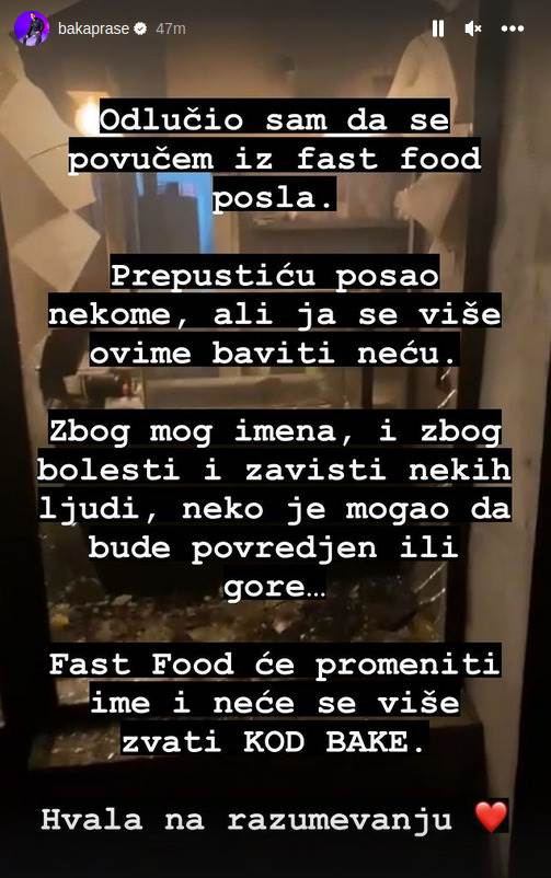„Prepustiću posao nekome, ali ja se više baviti ovim neću. Zbog mog imena i zbog bolesti i zavisti nekih ljudi, neko je mogao da bude povređen ili da mu se desi nešto još gore. Lokal će promeniti ime“, napisao je Baka Prase na svom Instagram profilu.
