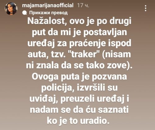 – Nažalost, ovo je drugi put da mi je postavljen uređej za praćenje ispod auta. Ovoga puta je pozvana policija, preuzeli su uređaj i nadam se da ću saznati ko je to uradio – napisala je Maja.