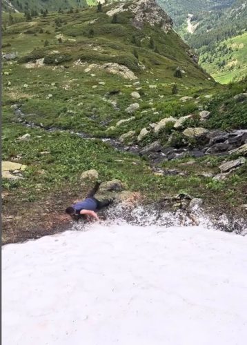 Međutim, snimak koji je objavio, mnoge je zabrinuo, jer je glumac seo na sneg i krenuo da se dupeta, ali se onda u jednom trenutku survao i završio u kamenjaru.