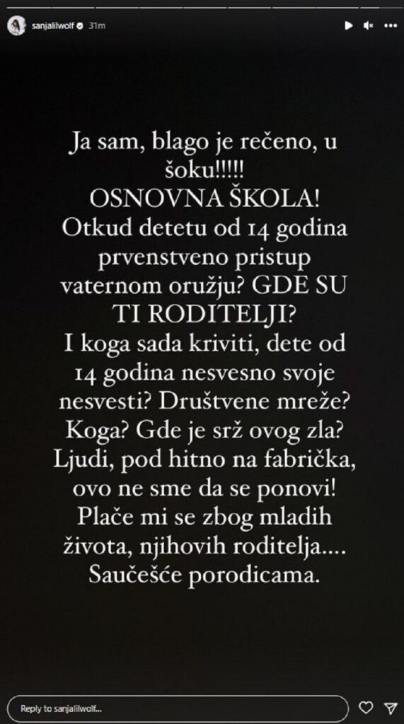 Pevačica Nina Badrić napisala je: „Ovo je strašno… Nemam reči za ovu tragediju. Saučešće porodicama.“ Sanja Vučić je putem Instagrama izrazila svoj šok i nevericu: „Ja sam, blago je rečeno, u šoku. Osnovna škola! Otkud detetu od 14 godina prvenstveno pristup vatrenom oružju? Gde su ti roditelji? I koga sad kriviti, dete od 14 godina nesvesno svoje nesvesti? Društvene mreže? Koga? Gde je srž ovog zla? Ljudi, pod hitno na fabrička, ovo ne sme da se ponovi! Plače mi se zbog mladih života, njihovih roditelja. Saučešće porodicama.“
