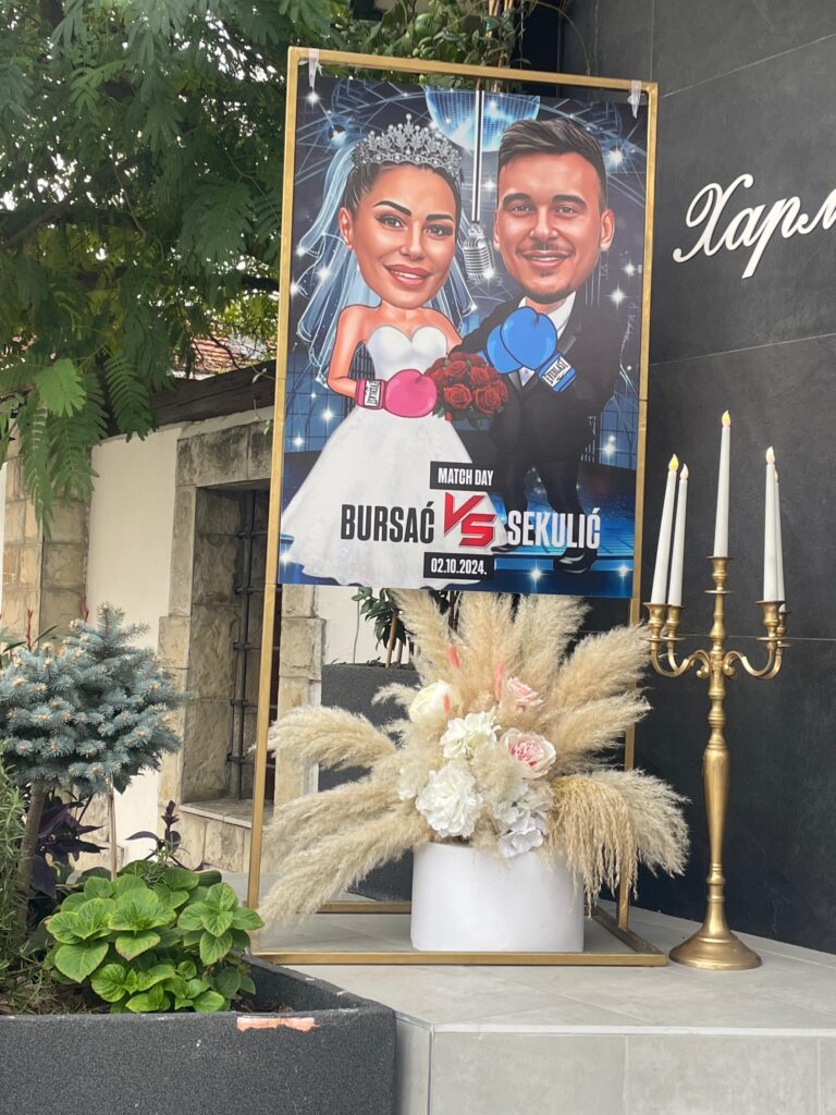 Ispred sale stoji specifičan plakat koji izgleda kao najava za meč. Dve karikature Aleksandre i Stevana predstavljaju njih kao mladu i mladoženju, ali sa bokserskim rukavicama.
