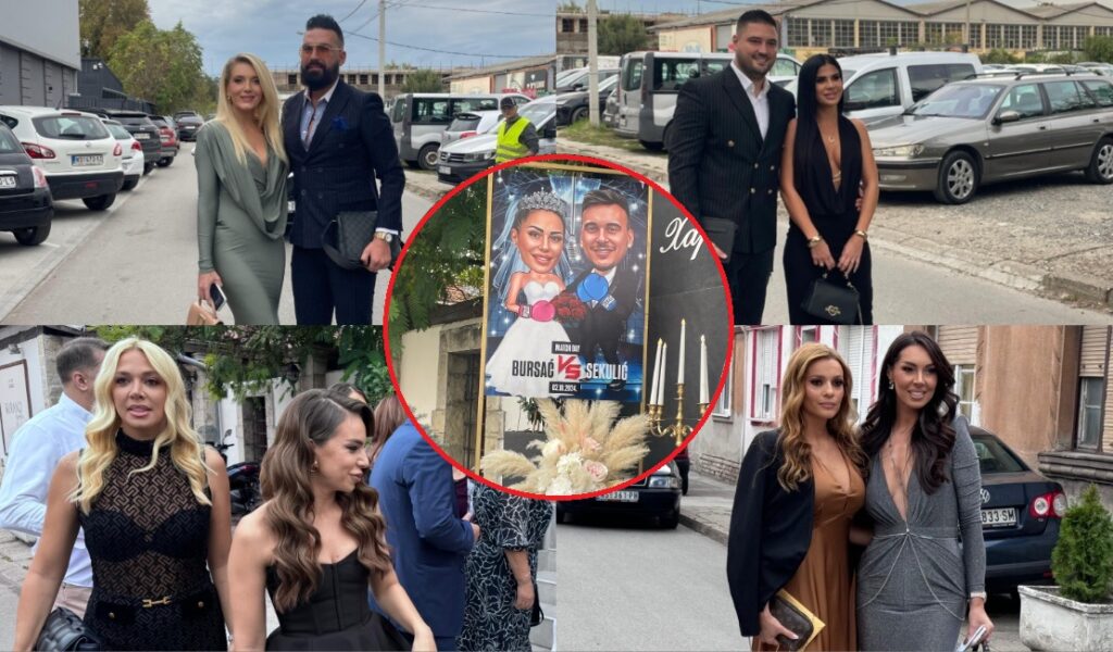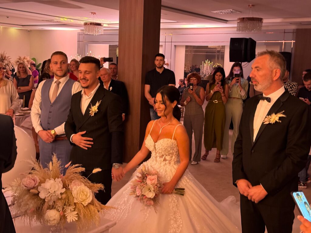 Bursaćeva je ponela raskošnu venčanicu sa dekolteom i sitnim bretelama, a korset je bio posut kristalima, dok je mladoženja bio u elegantnom crnom odelu i beloj košulji.