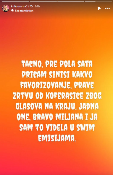 – Tačno pričam Siniši pre pola sata, kakvo je ovo favorizovanje, prave žrtvu od koferašice zbog glasova na kraju. Jadni. Miljana i ja smo to videle u svim emisijama – napisala je Marija.