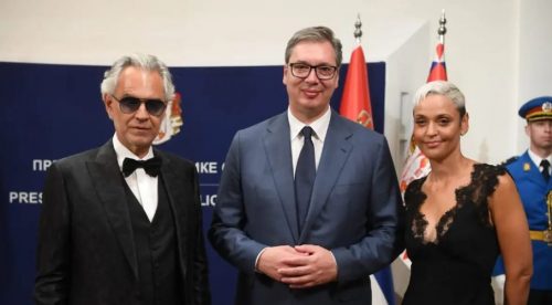 „Posebna mi je čast da večeras dodelim Zlatnu medalju za zasluge Andrei Bočeliju, jednom od najvećih tenora današnjice i umetniku koji kroz jedinstvenu i fascinantnu strast u interpretaciji, publici širom sveta poklanja nezaboravne emocije i spektakularan doživljaj muzike“, naveo je Vučić.