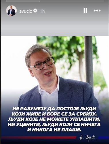 „Ne razumeju da postoje ljudi koji žive i bore se za Srbiju, ljudi koje ne možete uplašiti, ni uceniti, ljudi koji se ničega i nikoga ne plaše“, poručio je predsednik Vučić jutros na svom zvaničnom Instagram nalogu avucic.