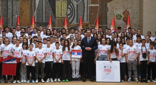 Predsednik Srbije Aleksandar Vučić primio je mlade sportiste sa Kosova i Metohije, iz Republike Srpske i dijaspore, učesnike kampa „Srbija te zove 2023“.