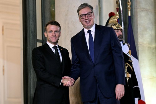 Predsednik Srbije, Aleksandar Vučić, obraća se javnosti nakon radne večere sa predsednikom Francuske, Emanuelom Makronom, u Jelisejskoj palati.