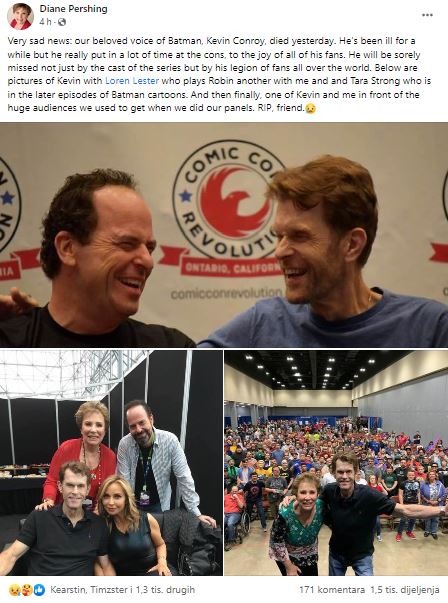 – Veoma tužna vest: Naš voljeni glas Betmena Kevin Konroj umro je juče. On je već neko vreme bio bolestan, ali je zaista uložio mnogo vremena u konvencije, na radost brojnih fanova – napisala je ona na Fejsbuku.