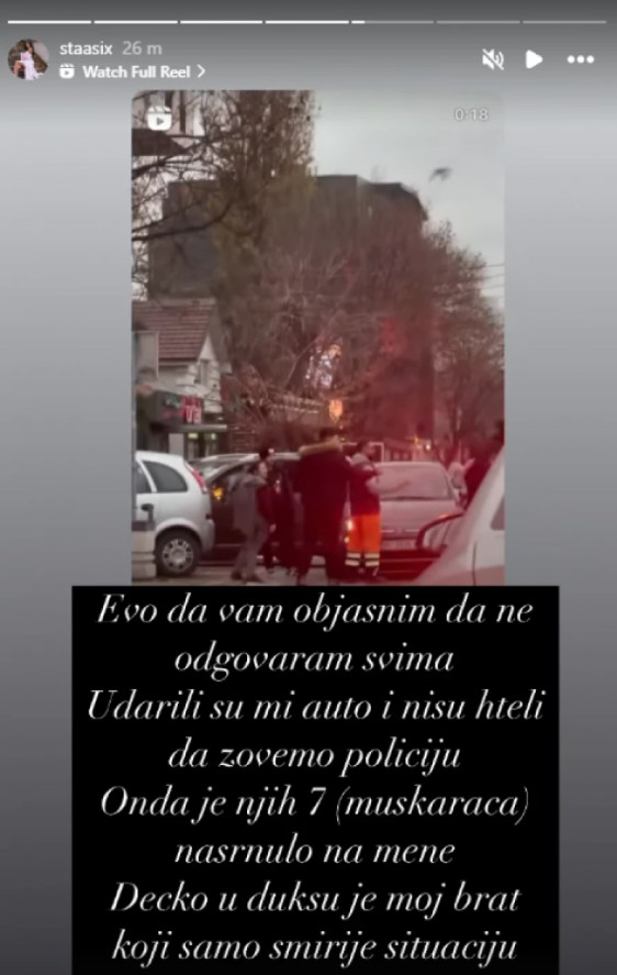 – Evo da vam objasnim da ne odgovaram svima. Udarili su mi auto i nisu hteli da zovem policiju. Onda je njih sedam muškaraca nasrnulo na mene. Dečko u duksu je moj brat, koji samo smiruje situaciju – napisala je Anastasija, a potom dodala fotografiju počupane kose i poručila: