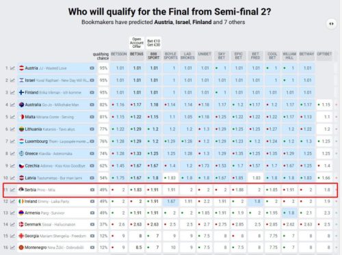 Svakako, kladionice mogu da pogreše, kao što je to bio slučaj u prvoj polufinalnoj večeri. Tada su, naime, kladionice predviđale prolazak Portugalu, ali je umesto njih prošao Island. To je, doduše, jedina greška koju su kladionice napravile, a nadamo se da će takav slučaj biti i sa predstavnikom Srbije.