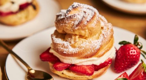 Rernu zagrejte na 200 stepeni. U jednoj posudi zagrejte vodu sa puterom. Onda dodajte brašno i so i mešajte sve dok se ne zgusne.Pustite da se malo prohladi.Zatim dodajte jedno po jedno jaje, uz mućenje, sve dok ne dobijete glatko testo.U dresing vrećicu stavite testo pa stiskujte krofnice na pleh obložen pek papirom. Pecite oko 25 minuta, u rerni zagrejanoj na 200 stepeni. Zasebno umutite slatku pavlaku sa šećerom u prahu dok ne postane čvrst šlag. Jagode iseckajte na tanke kriške. Na pola isecite krofnice pa ih napunite šlagom i dodajte kriške jagoda. Vratite gornju polovinu krofnice, pa pospite krofnice šećerom u prahu.