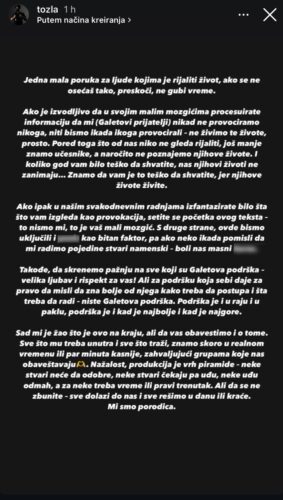 – Ako je izvodljivo da u svojim malim mozgićima procesuirate informaciju da mi (Galetovi prijatelji) nikad ne provociramo nikoga. Niti bismo ikada ikoga provocirali, ne živimo te živote prosto. Pored toga što od nas niko ne gleda rijaliti, još manje znamo učesnike, a naročito ne poznajemo njihove živote – nastavlja Tozla.