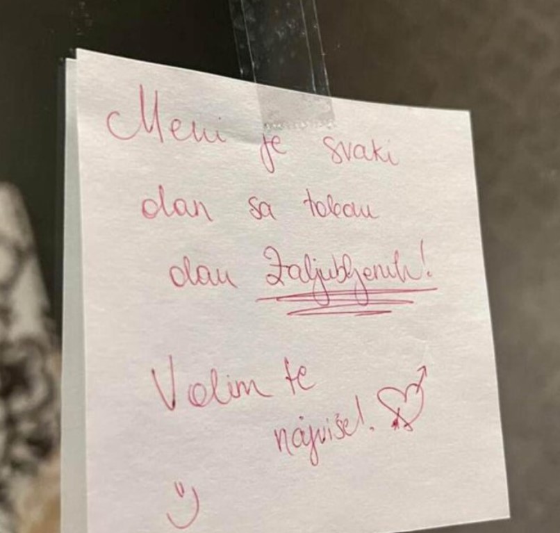 – Meni je svaki dan sa tobom Dan zaljubljenih! Volim te najviše – piše u poruci zalepljenoj na ogledalu.