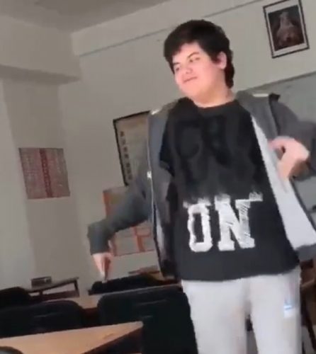 Uroš je na video-snimku koji je postao viralan na društvenim mrežama, đuskao u školskoj učionici, a u jeku dobrog raspoloženja uvijao je kukovima i spuštao se do poda.