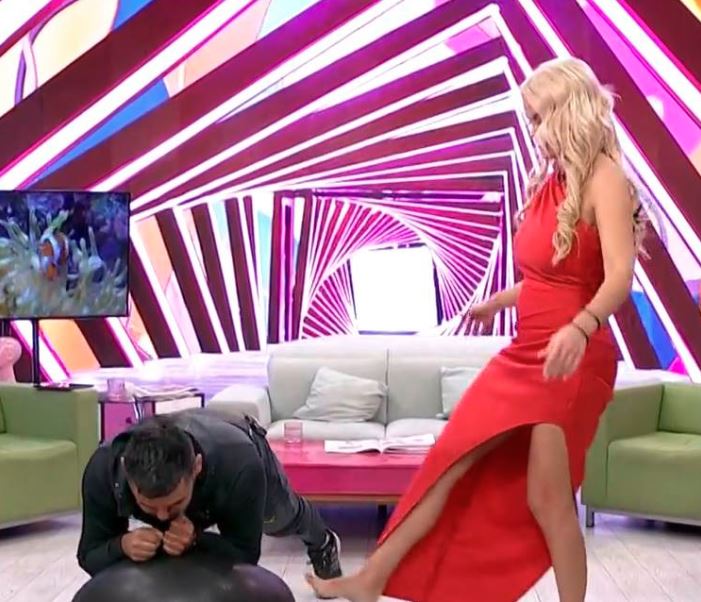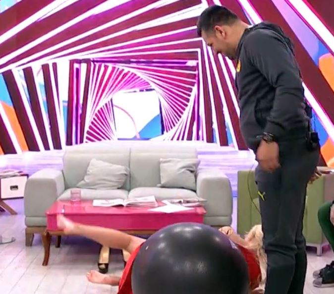 Sada je, obučena u dugu, crvenu haljinu i visoke potpetice, završila na patosu. Gost u studiju je bio trener koji je želeo da testira i Sanju i njene kolege. Doneo je loptu za vežbanje, na koju su voditelji morali da budu naslonjeni sve vreme dok je on šutira, i pokušavaju da održe ravnotežu.