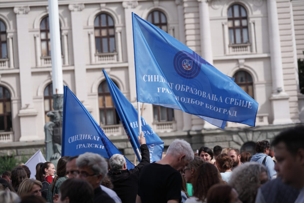 Predstavnci četiri sindikata prosvetnih radnika danas su protestvovali u centru Beograda. Među njima su Unija sindikata prosvetnih radnika Srbije, Sindikata obrazovanja Srbije, GSPRS Nezavisnost i Sindikata radnika u prosveti Srbije.