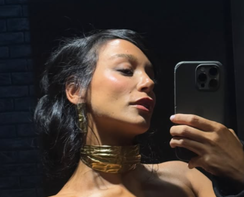 Svoj izgled upotpunila je zlatnim detaljima, minđušama i ogrlicom.