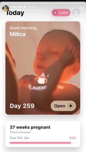 Naime, ona je ušla u 37. nedelju trudnoće, tačnije u deveti mesec. Prema programu mobilnog telefona koji „prati njenu trudnoću“, danas joj je 259 dan kako je u drugom stanju. Naglašeno je i kako bi beba trebalo da dođe na svet 5. januara.