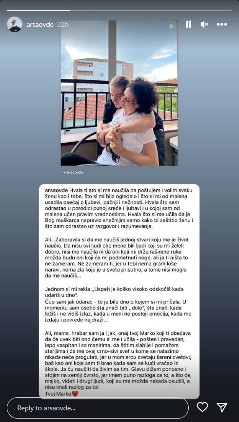 Sada se Arsa oglasio po prvi put nakon ovog incidenta i putem društvenih mreža uputio izuzetno moćnu poruku svojoj majci. Uz fotografiju sa svojom mamom napisao je: