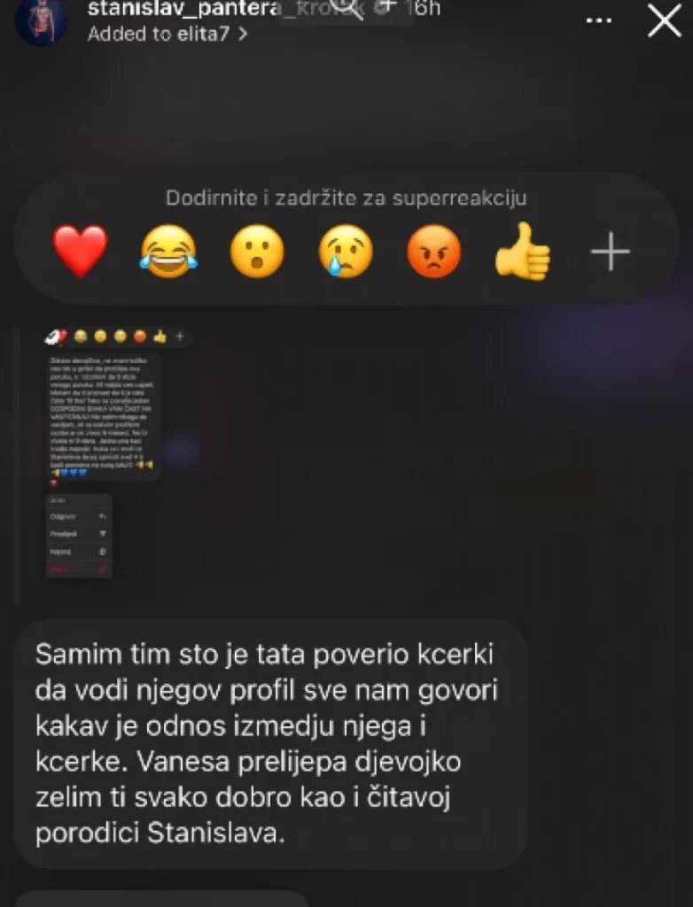 -Samim tim što je tata poverio ćerki da vodi njegov profil sve nam govori kakav je odnos između njega i ćerke. Vanesa, prelepa devojko, želim ti svako dobro, kao i čitavoj porodici Stanislava – glasila je poruka koje je objavljena.