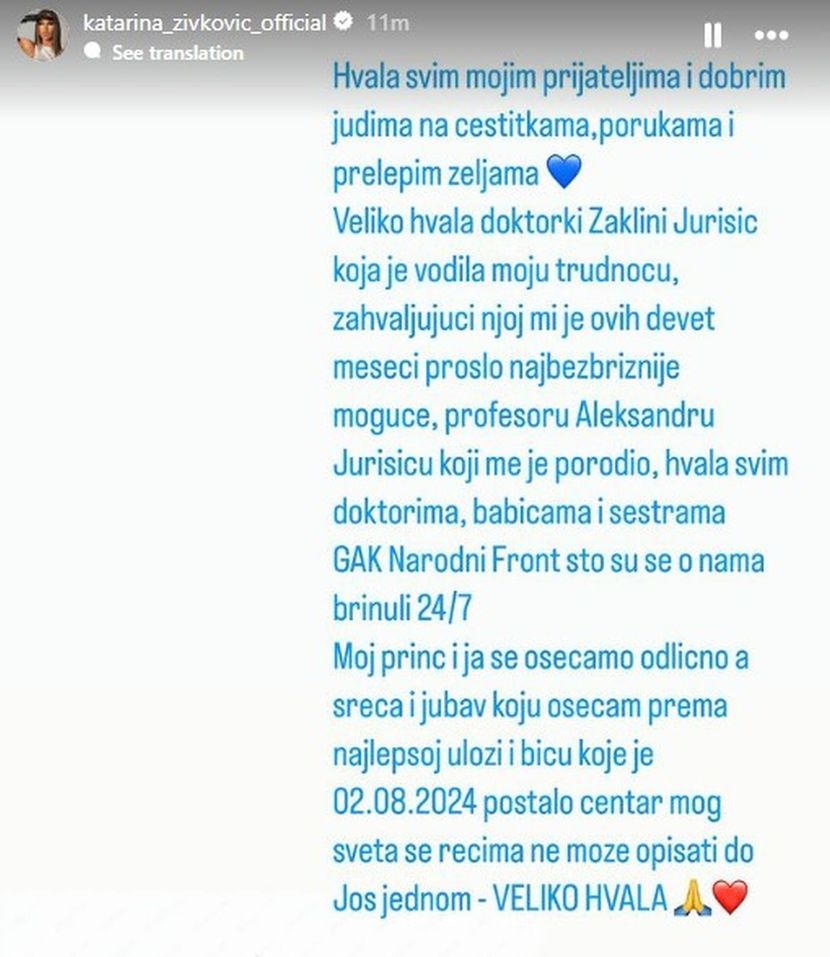–Hvala svim mojim prijateljima i dobrim ljudima na čestitkama, porukama i prelepim željama. Veliko hvala i doktorki koja je vodila moju trunoći, zahvaljujući njoj je ovih devet meseci prošlo najbezbrižnije moguće. Moj princ i ja se osećamo odlično, a sreća i ljubav koju osećam prema najlepšoj ulozi i biću koje je 02.08.2024. postalo centar mog sveta se ne može rečima opisati. Još jednom veliko hvala – napisala je Katarina.