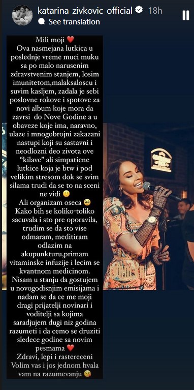 – Kako bih se koliko toliko sačuvala i što pre oporavlila trudim se da što više odmaram, meditiram, odlazim na akupunkturu, primam vitaminske infuzije i lečim se kvantnom medicinom. Nisam u stanju da gostujem u Novogodišnjim emisijama, nadam se da će me moji dragi prijatelji novinari i voditelji sa kojima sarađujem razumeti i da ćemo se družiti sledeće godine sa novim pesamama. Zdravi, lepi i rasterećeni. Volim vas i još jednom hvala na razumevanju – napisala je Katarina u svojoj objavi.
