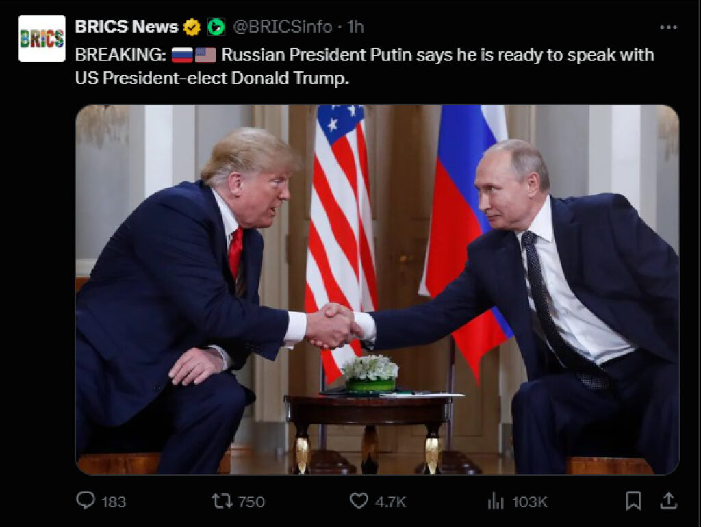 BRIKS njuz je preko svog Iks naloga preneo da je predsednik Putin kao i ministar spoljnih poslova Sergej Lavrov pokazao otvorenost za toplije odnose sa SAD nakon inauguracije Donalda Trampa.