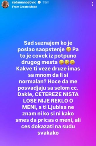 – Što se tiče saopštenja navodne mesne zajednice u mom selu (to je zapravo jedan čovek), a čije gluposti su nažalost objavljene, sve što je rekao o meni je laž i on će za to biti tužen. Tako da znaš, dragi čika Ljubiša – objavila je Rada Manojlović na Instagramu.