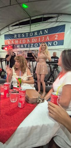 Naime, kako se vidi na video snimku Rada je bila obučena u roze kratku šljokičavu haljinu, dok ljudi za kariranim stoljnjacima sede i slušaju njenu muziku.