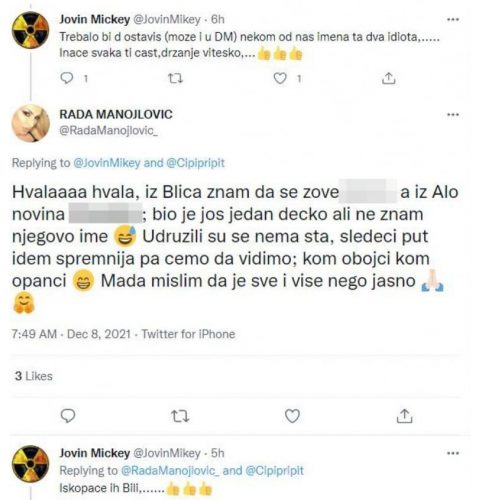 Da joj to nije bilo dovoljno, svedoči i prepiska sa tviterašima koji se kriju iza lažnih imena, jer kako bi drugačije i mogli da prete iza svojih tastatura.