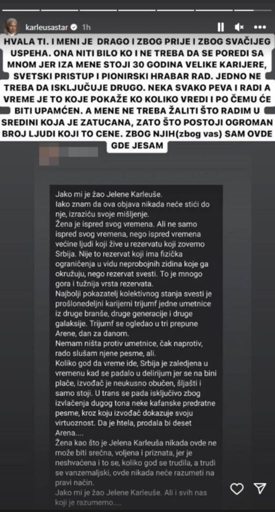 Osim što je podelila objavu, Karleuša je dodala i svoj komentar, koji je mnoge zbunio, s obzirom da je do skoro brutalno kritikovala njen lik i delo – „Hvala ti. I meni je drago zbog Prije i zbog svačijeg uspeha. Ona niti bilo ko i ne treba da se poredi sa mnom jer iza mene stoji 30 godina velike karijere, svetski pristup i pionirski hrabar rad. Jedno ne treba da isključuje drugo. Neka svako peva i radi, a vreme je to koje pokaže ko koliko vredi i po čemu će biti upamćen. Mene ne treba žaliti što radim u sredini koja je zatucana, zato što postoji ogroman broj ljudi koji to cene. Zbog njih sam ovde gde jesam“, dodala je Karleuša.