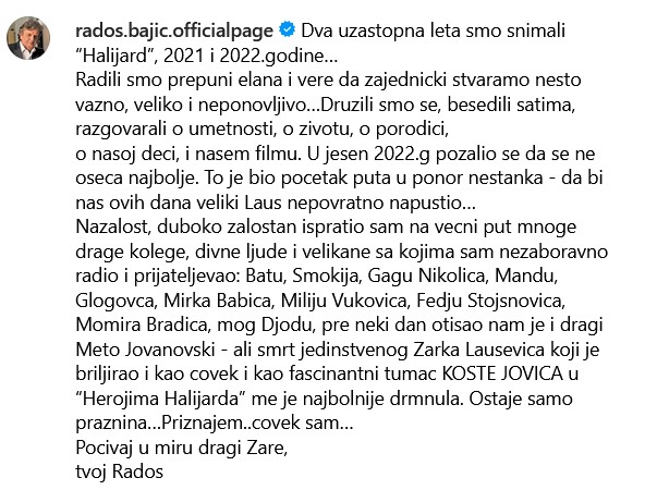 – Nažalost, duboko žalostan ispratio sam na večni put mnoge drage kolege, divne ljude i velikane sa kojima sam nezaboravno radio i prijateljevao: Batu, Smokija, Gagu Nikolića, Mandu, Glogovca, Mirka Babića, Miliju Vukovića, Feđu Stojanovića, Momira Bradića, mog Đodu, pre neki dan otišao nam je i dragi Meto Jovanovski – ali smrt jedinstvenog Žarka Lauševića koji je briljirao i kao čovek i kao fascinantni tumač Koste Jovića u „Herojima Halijarda“ me je najbolnije drmnula. Ostaje samo praznina… Priznajem.. Čovek sam… Počivaj u miru dragi Žare, tvoj Radoš – napisao je Bajić i podelio fotografiju sa Žarkom.