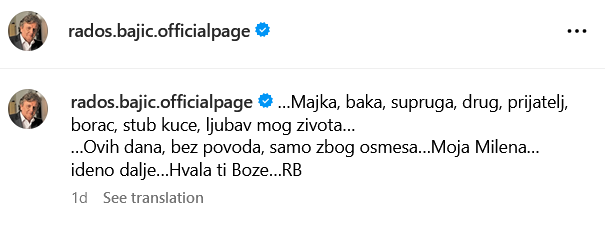 – Majka, baka, supruga, drug, prijatelj, borac, stub kuće, ljubav mog života… Ovih dana, bez povoda, samo zbog osmeha… Moja Milena… Idemo dalje… Hvala ti Bože – napisao je Radoš Bajić.