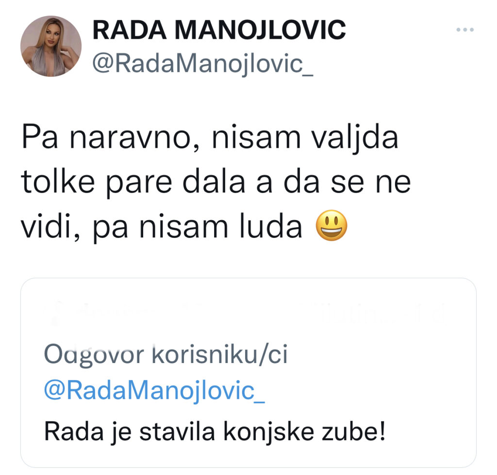 – Rada je stavila konjske zube! – napisao je korisnik pomenute društvene mreže, a onda je usledio Radin odgovor: