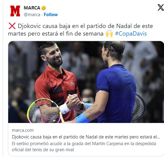 Najuspešniji teniser u istoriji Novak Đoković odavno je najavio da će se pojaviti na Dejvis kupu u Malagi, pošto će se na tom turniru Rafael Nadal oprostiti od „belog sporta“.