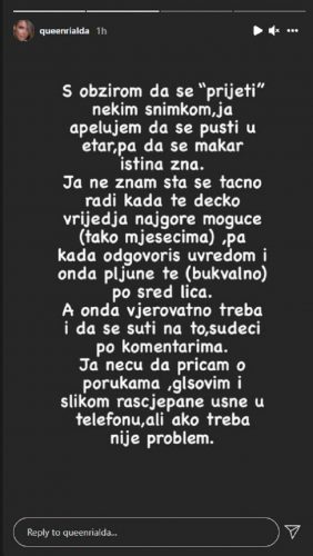 – S obzirom na to da se „preti“nekim snimkom, ja apelujem da se pusti u etar, pa da se makar istina zna. Ja ne znam šta se tačno radi kada te dečko vređa najgore moguće (tako mesecima), pa kad odgovoriš uvredom i onda te pljune (bukvalno) po sred lica? A onda verovatno treba da se ćuti na to, sudeći po komentarima. Ja neću da pričam o porukama, glasovnim i slikom rascepljene usne u telefonu, ali ako treba nije problem – napisala je Rialda, a potom i objavila sve o čemu je govorila.