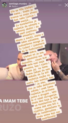 – Ovo je naša konačna odluka i uvek ćemo govoriti najbolje jedno o drugom, bez obzira što bi mnogi voleli drugačije. Hvala Nini, koja je bila uz Konstantina sve vreme dok smo bili u rijalitiju – potrudićemo se da joj to nadoknadimo.