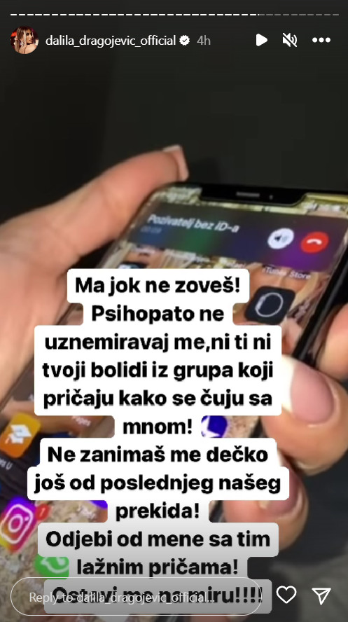 Dalila je na svom Instagram nalogu optužila Cara da je zove sa nepoznatog broja i da je unemirava, što je, kako je navela, krenulo još 5-og oktobra.