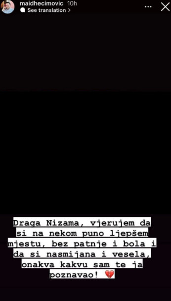 – Draga Nizama, verujem da si na nekom puno lepšem mestu, bez patnje i bola i da si nasmejana i vesela, onakva kakvu sam te ja poznavao – napisao je Maid Hećimović.