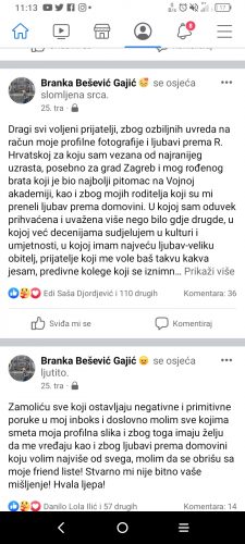 -Dragi svi voljeni prijatelji, zbog ozbiljnih uvreda na račun moje profilne fotografije i ljubavi prema R. Hrvatskoj za koju sam vezana od najranijeg uzrasta, posebno za grad Zagreb i mog rođenog brata koji je bio najbolji pitomac na Vojnoj akademiji, kao i zbog mojih roditelja koji su mi preneli ljubav prema domovini. U kojoj sam oduvek prihvaćena i uvažena više nego bilo gdje drugde, u kojoj već decenijama sudjelujem u kulturi i umjetnosti, u kojoj imam najveću ljubav-veliku obitelj, prijatelje koji me vole baš takvu kakva jesam, predivne kolege koji se iznimno vesele našoj suradnji i koji me uvek zovu da stvaramo i koji neprestano nagrađuju moj rad. Gde imam predivnu publiku koja se iznova veseli mojim delima i susretu sa mnom. Mnogo sam nagrada donela baš odatle R. Srbiji da bi danas bila za pojedine i to za establišment ekskomunicirana, gde se nazivam uvredljivim i pogrdnim imenima na „U“, gde mi se govori da trebam da odem milom ili silom iz R. Srbije. Šta to znači? Pretužna sam zbog takvog stava, i s obzirom da sam se bavila filmom „Lauš“ gde je jedan umjetnik stradao samo kao koletaralna šteta, gdje sam takođe mnogo ispaštala i bila anatemisana u mnogim krugovima jer sam kritizirala ultranacionalistički metež, koji je pratio izvođenje jednog dramskog komada. Poučena tim iskustvom, plašim se da ovo može da eskalira u još veće razapinjanje i zbog toga sam prisiljena da svoj FB profil deaktiviram na neki period. Do danas sam mislila da imam dve domovine. Danas ću razmisliti da li ima svrhe ostati negde gde vas teraju, upućuju prijetnje, vređaju, ponižavaju i ne daju vam da volite svoje. Zašto? Zar ljubav nekome smeta? Svaka čast izuzecima, divnim prijateljima, prekrasnim kolegama i najboljim na svetu mojim profesorima, koji su takođe bili žrtve, i baš za ove koji mene sada napadaju, napadali su moje uzore, moji profesori su za njih bili izdajnici i izrodi. Proterivani su odavde i unatoč tome su me učili da volim ceo svet i kojima nikada nije moja ljubav smetala prema nijednoj domovini već su salutirali i podržavali moj rad. Zamoliću sve svoje prijatelje i sve ljude sa kojima sam bila kontaktu da našu komunikaciju nastavimo putem mobitela i da budu slobodni da me kontaktiraju za sve što je u mom domenu. Hvala na divnim godinama i hvala svima koji su pratili moj rad i koji su me voleli baš takvu kakva jesam. U nadi da je deaktivacija privremena i da ću se možda nekada vratiti. Do tada volim vas sve pa čak i vas koji me izgonite. Ne mogu mrzeti u 21. stoljeću nikoga posebno ne zbog nacije, vjere, boje kože ili samo zbog toga što drugačije misli. U mom srcu je ljubavi za cijeli svijet!