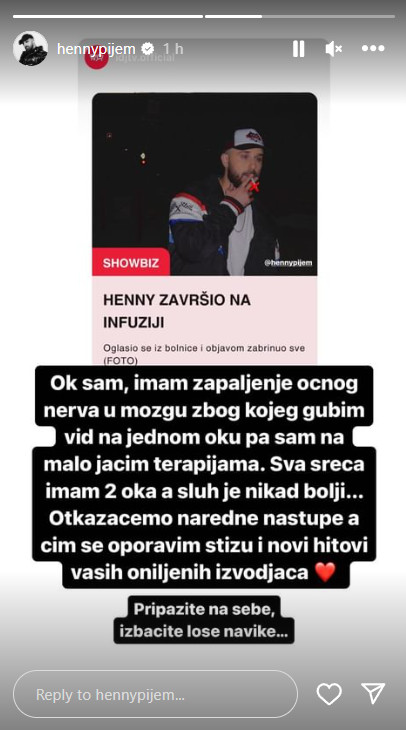 Reper Miloš Stojković, poznatiji kao Heni, zabrinuo je svoje pratioce na Instagramu kada je objavio fotografiju na kojoj prima infuziju.