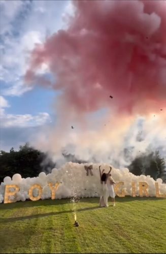 Fudbaler i njegova žena stajali su ispred ogromnog zida od belih balona, a iza njih je pušten vatromet u crvenoj boji – što je označilo dolazak devojčice!