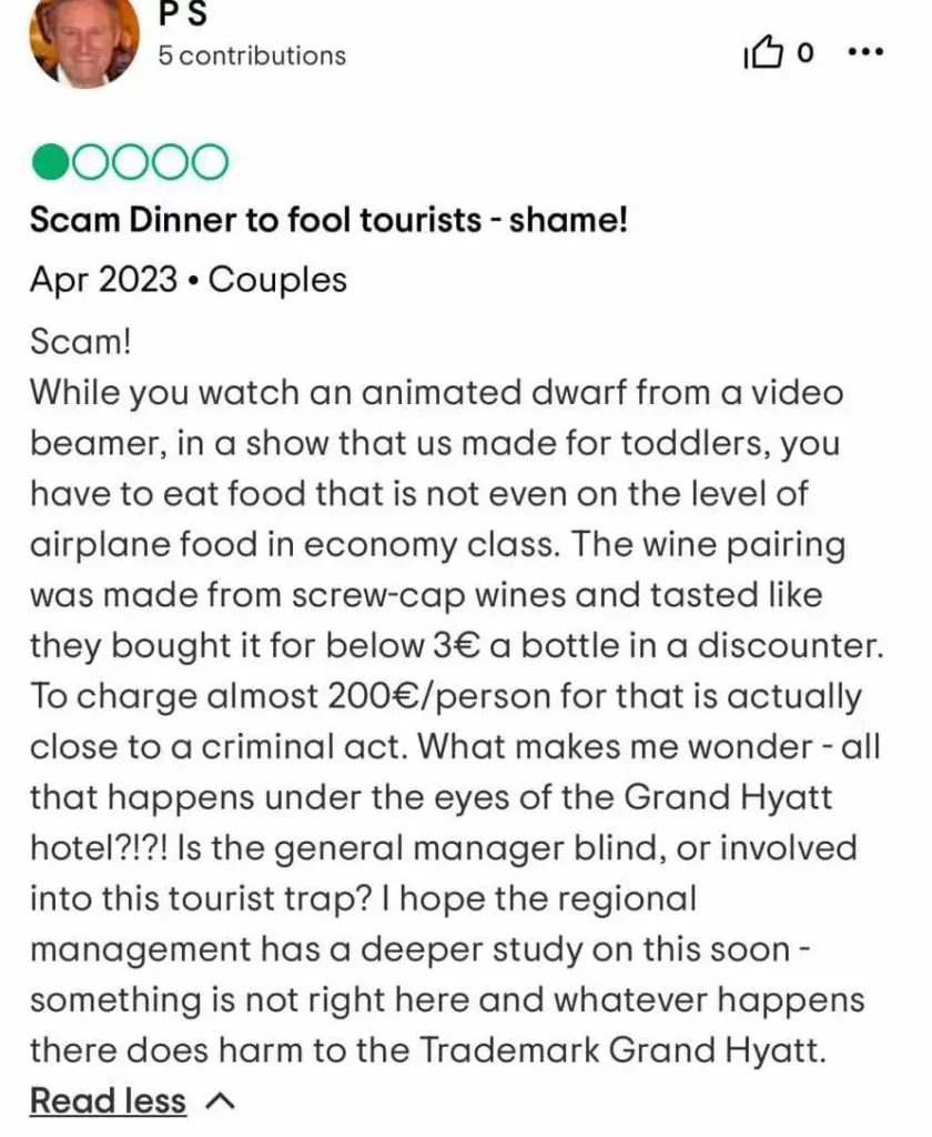 Stranci ne kriju svoj bes i ogorčenost nakon posete ovom mestu – loša usluga, razočaravajuća hrana i cena koja je potpuno nerealna. Ovaj restoran je postao prava svetska prevara. Mnogi se osećaju iznevereno, jer su očekivali mnogo više za novac koji su platili.