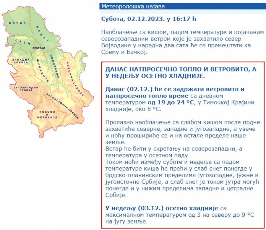 Tokom noći između subote i nedelje sa padom temperature kiša će preći u slab sneg ponegde u brdsko-planinskim predelima jugozapadne, južne i jugoistočne Srbije, a slab sneg je tokom jutra moguć ponegde i u nižim predelima zapadne i cetnralne Srbije, stoji u najavi od 16:17 časova.