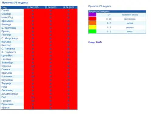 U periodu od sutra pa do kraja nedelje očekuje se vrlo visok UV indeks, uz temperaturu preko 35 °C, pa se preporučuju zaštitne mere tokom boravka na suncu između 10 i 16 časova.