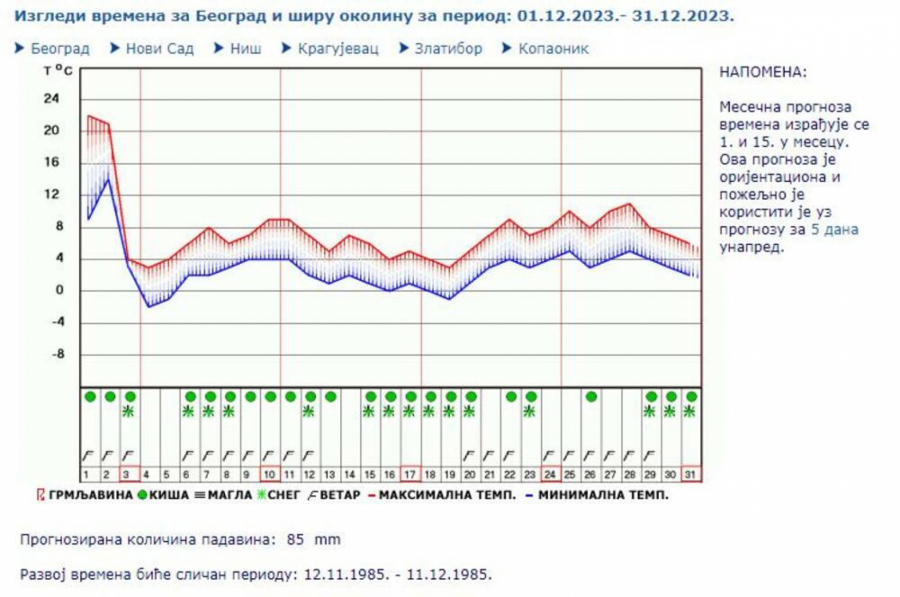 Grafikon Republičkog hidrometeorološkog zavoda pokazuje naznake belih pahulja, pa u toj tabeli uz pojedine datume stoji oznaka za sneg.