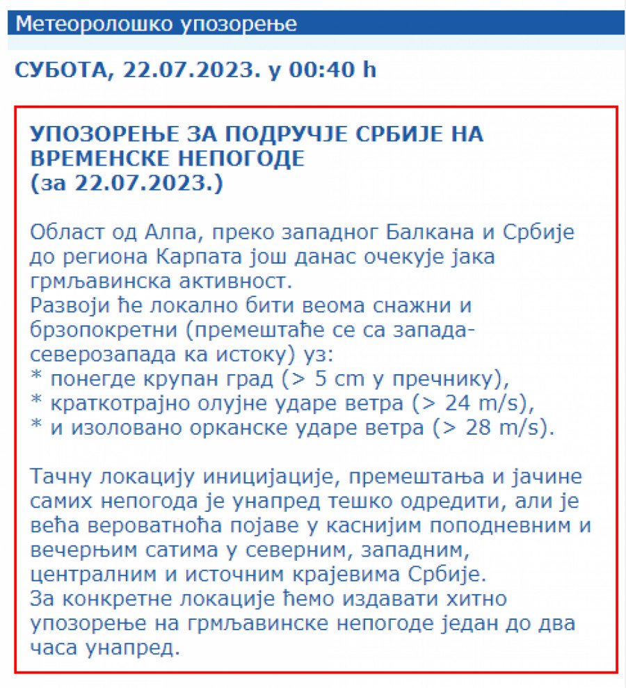 Razvoji će lokalno biti veoma snažni i brzopokretni i premeštaće se sa zapada-severozapada ka istoku, uz ponegde krupan grad, veći od 5 centimetara u prečniku, kratkotrajno olujne udare vetra, jače od 24 metra u sekundi i izolovano orkanske udare vetra jače od 28 metara u sekundi.