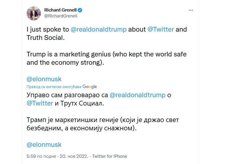 Upravo sam razgovarao sa Donaldom Trampom o Tviteru i „Trut Soušal“. Tramp je marketinški genije (zbog kog je svet bio bezbedan, a ekonomija snažna) – napisao je Ričard Grenel na Tviteru, i „tagovao“ Ilona Maska.